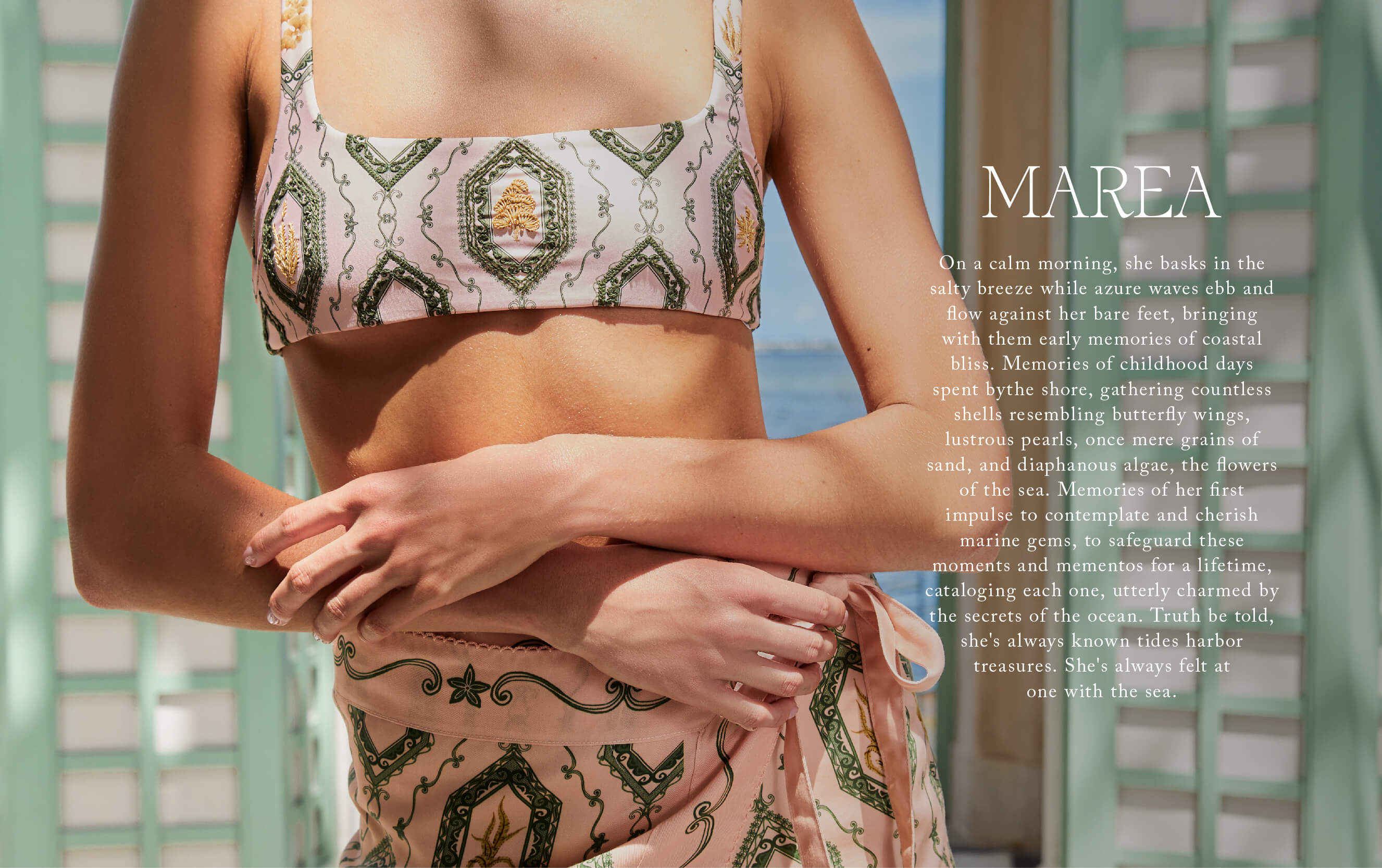 On a calm morning, she basks in the salty breeze while azure waves ebb and flow against her bare feet, bringing with them early memories of coastal bliss. Memories of childhood days spent bythe shore, gathering countless shells resembling butterfly wings, lustrous pearls, once mere grains of sand, and diaphanous algae, the flowers of the sea. Memories of her first impulse to contemplate and cherish marine gems, to safeguard these moments and mementos for a lifetime, cataloging each one, utterly charmed by the secrets of the ocean. Truth be told, she's always known tides harbor treasures. She's always felt at one with the sea.