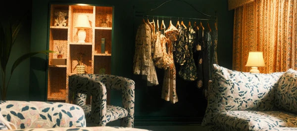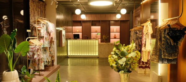 Located in the enchanting city of Cartagena, our flagship store is an ode to warm weather and captivating historic architecture. With beautiful adobe brick arches, floors in green checkered tiles that mirror the lush nature outside, and delicate iron racks made by local artisans, this space features a special nook adorned with one of our very first sewing machines and a stunning dress from our first collection that wonderfully represents the essence of our brand.
